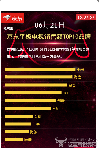 根据京东发布的6月1日0时-6月19日24时数据可以看到,创维此次在京东平板电视销售额TOP10品牌中排名第五,而小米、海信、夏普、TCL占据销售额排行榜第一至第四名。