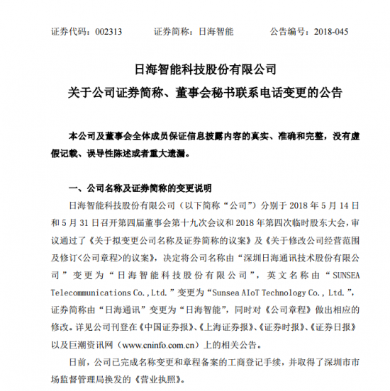 运营商世界网讯,6月22日,日海智能科技股份有限公司发布了上市公告显示,将“深圳日海通讯技术股份有限公司”变更为“ 日海智能科技股份有限公司 ”,英文名称由“ SUNSEA Telecommunications Co.,Ltd.”变更为“Sunsea AIoT Technology Co., Ltd.”, 证券简称由“日海通讯”变更为“日海智能”,但证券代码表示不变,仍为002313 。