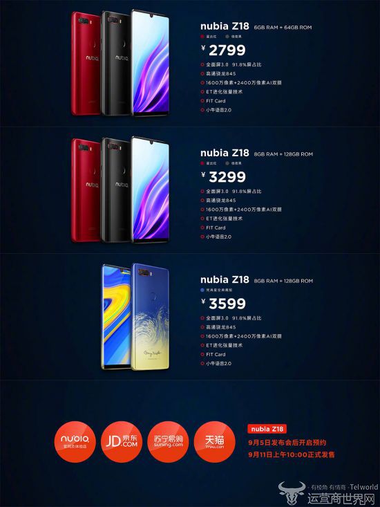 据悉,努比亚旗舰手机Z18将在努比亚官网及线下体验店,还有京东、苏宁易购、天猫这些平台开始预约,9月11日上午10时正式发售。除此之外关于努比亚Z18的价格,6+64GB版本售价2799元,8+128GB版本售价3299元,而梵高星空典藏版手机售价为3599元。