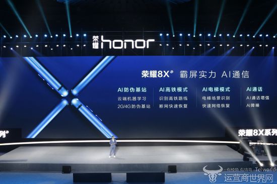 荣耀8X内置AI通信技术,包括AI防伪基站、AI高铁模式、AI电梯模式、AI通话四项功能。AI防伪基站可以实现2G/4G网络防伪;AI高铁模式可以实现京沪高铁5小时全程不掉线;AI电梯模式可以实现最快3s恢复4G网络;AI通话可以实现通话增强和降噪效果。