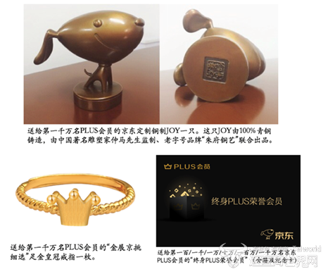除了PLUS DAY的优惠回馈,京东这次还特别为第一千万个PLUS会员准备了颇具纪念意义的礼物:终身PLUS荣誉会员,由老字号品牌“朱府铜艺”定制的京东JOY一只,由珠宝品牌“金展京挑细选”定制的足金皇冠戒指一枚。另外,京东也将为PLUS的第一百、一千、一万、十万、一百万位会员送上终身PLUS荣誉会员的福利。