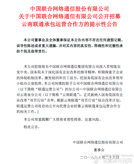 10月28日,中国联通发布了公开招募云南联通承包运营合作的提示性公告,公告显示,中国联合网络通信有限公司云南省分公司正式被纳入国务院国有企业改革“双百行动”名单,根据云南联通“双百行动”综合改革计划,联通运营公司将启动公开向民营企业招募云南联通承包运营合作方的相关工作。