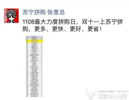 这张截图来自苏宁拼购总经理张奎的微信朋友圈:“1108最大力度拼购日,双十一上苏宁拼购,更多、更快、更好、更省!”并配了一张苏宁拼购的爆款清单。