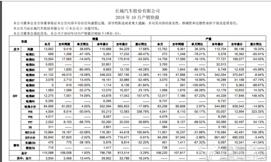 11月7日,长城汽车股份有限公司公布了10月产销快报,哈弗系列单月销量同比和累计销量同比整体下滑,产量亦然。