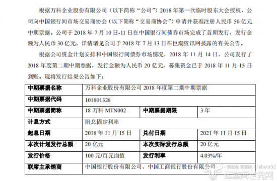 近日,万科A发布公告称,已于11月14日发行了2018年度第二期中期票据,发行金额为人民币20亿元。