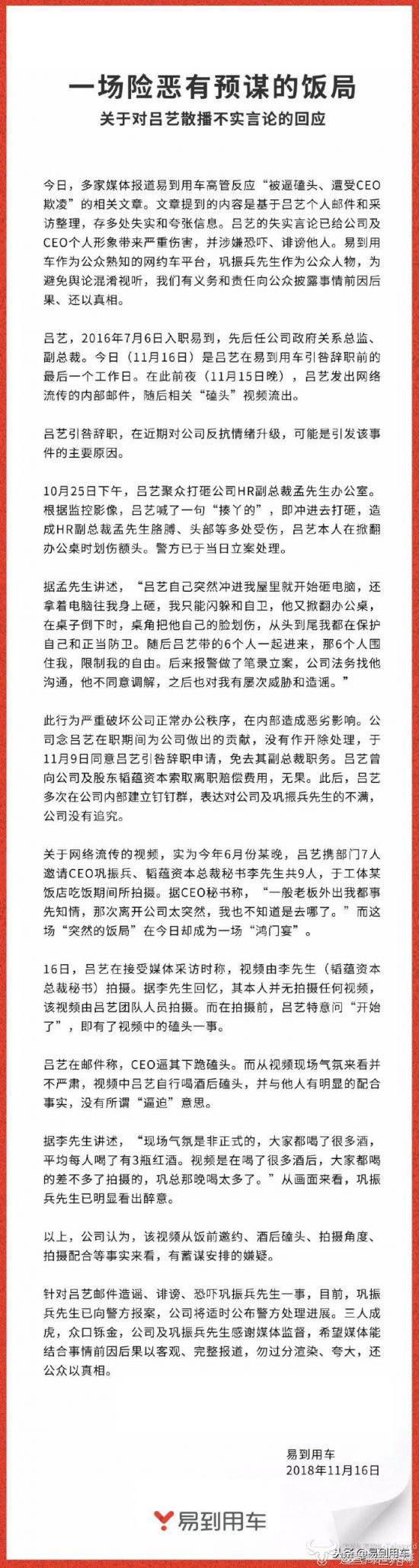 11月16日,易到在微头条对有媒体报道的“易到用车高管反应‘被逼磕头’、‘遭受CEO欺凌’”的相关文章所传播的内容进行了“关于对吕艺散播不实言论的回应”,并表示这是“一场险恶有预谋的饭局”。