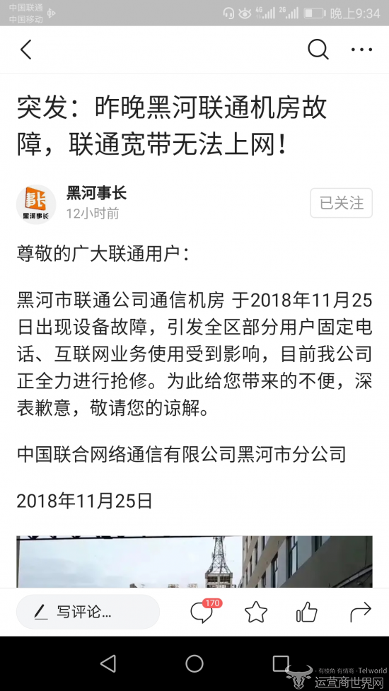 不过,目前黑河联通还未公布故障原因,运营商世界网也将等待进一步调查结果。