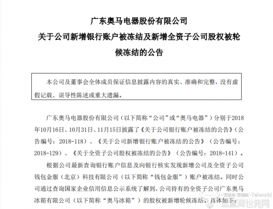 奥马电器分别于今年10月16日、10月31日、11月15日披露了《关于公司银行账户被冻结的公告》、《关于公司新增银行账户被冻结的公告》和《关于全资子公司股权被冻结的公告》。