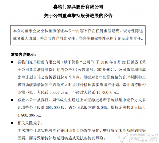 喜临门曾于今年8 月22日披露《关于公司董事增持股份计划的公告》,董事周伟成计划自该公告披露日起6个月内,根据对公司股票价值的合理判断和二级市场波动情况独立判断买入时点和价格逐步实施增持计划,累计增持股份金额不低于人民币 5千万元,不超过人民币 1亿元。