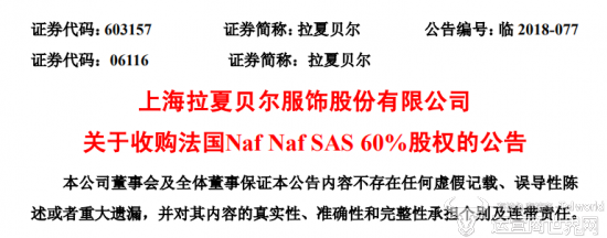 近日,上海拉夏贝尔服饰股份有限公司(以下简称为“拉夏贝尔”)发布了关于收购法国Naf Naf SAS 60%股权的公告。