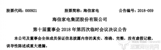 近日,海信家电集团股份有限公司(以下简称为“海信家电”)发布了第十届董事会 2018 年第四次临时会议决议公告。