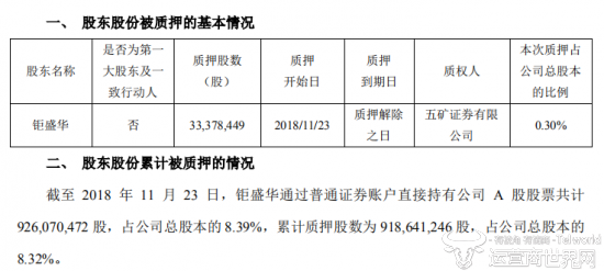 公告显示,截至 2018 年 11 月 23 日,钜盛华通过普通证券账户直接持有万科A股股票共计9.26亿股,占万科总股本的8.39%,累计质押股数为 9.186亿股,占万科总股本的8.32%。