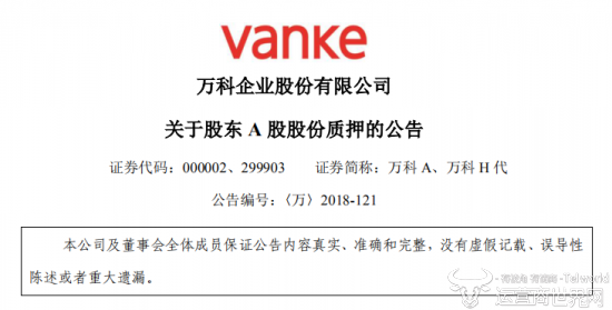 据了解,万科于2018年11月26日收到其公司股东深圳市钜盛华股份有限公司(以下简称“钜盛华”)的《告知函》表示,2018年11月23日,钜盛华将持有的万科3337.85万股无限售流通A股通过质押式回购方式质押给五矿证券有限公司,并已在中国证券登记结算有限责任公司深圳分公司办理完成股权质押登记手续,该部分股权质押期限自2018年11月23日起至质押解除之日止。