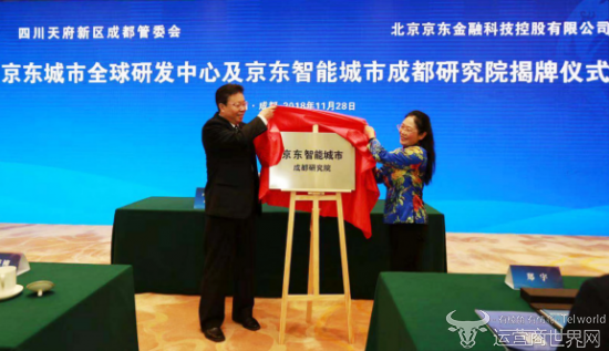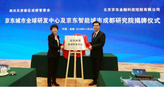 11月28日,京东城市的全球研发中心项目在成都签约,京东城市将在天府新区建设京东城市全球研发中心。成都市副市长刘筱柳,四川天府新区管理委员会办公室常务副主任、四川天府新区成都党工委书记、管委会主任刘任远,京东集团副总裁、京东数字科技首席数据科学家、京东智能城市研究院院长郑宇教授出席签约仪式。签约现场,双方共同为京东城市全球研发中心及京东智能城市成都研究院揭牌。