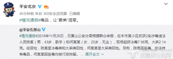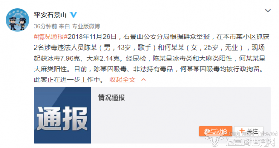 平安石景山发布微博称,“11月26日,石景山公安分局根据群众举报,在本市某小区抓获2名涉毒违法人员陈某(男,43岁,歌手)和何某某(女,25岁,无业),现场起获冰毒7.96克、大麻2.14克。经尿检,陈某呈冰毒类和大麻类阳性,何某某呈大麻类阳性。目前,陈某因吸毒、非法持有毒品,何某某因吸毒均被行政拘留。此案正在进一步工作中。”