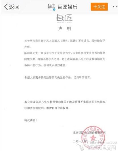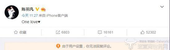有网友调侃,“One love”或许是谐音“完啦”的意思。同时,巨匠娱乐的声明现已删除,陈羽凡的微博也已经关闭了评论,看来其吸毒被抓一事或许为真。