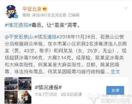 2018年11月26日,石景山公安分局根据群众举报,在本市某小区抓获2名涉毒违法人员陈某(男,43岁,歌手)和何某某(女,25岁,无业),现场起获冰毒7.96克、大麻2.14克。经尿检,陈某呈冰毒类和大麻类阳性,何某某呈大麻类阳性。目前,陈某因吸毒、非法持有毒品,何某某因吸毒均被行政拘留。此案正在进一步工作中。