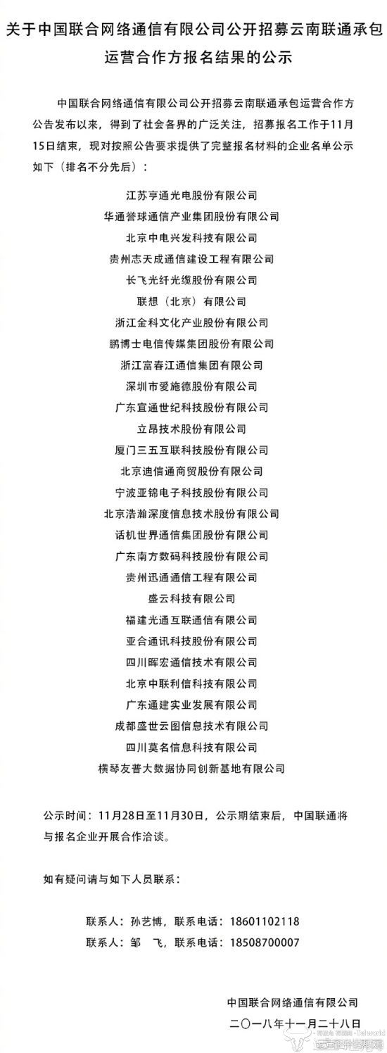 今天,中国联通公开招募云南联通承包运营合作方报名结果已公示,共28家企业报名,其中不乏联想、迪信通这样的大企业,也有亨通光电、长飞光纤这种知名设备制造商。