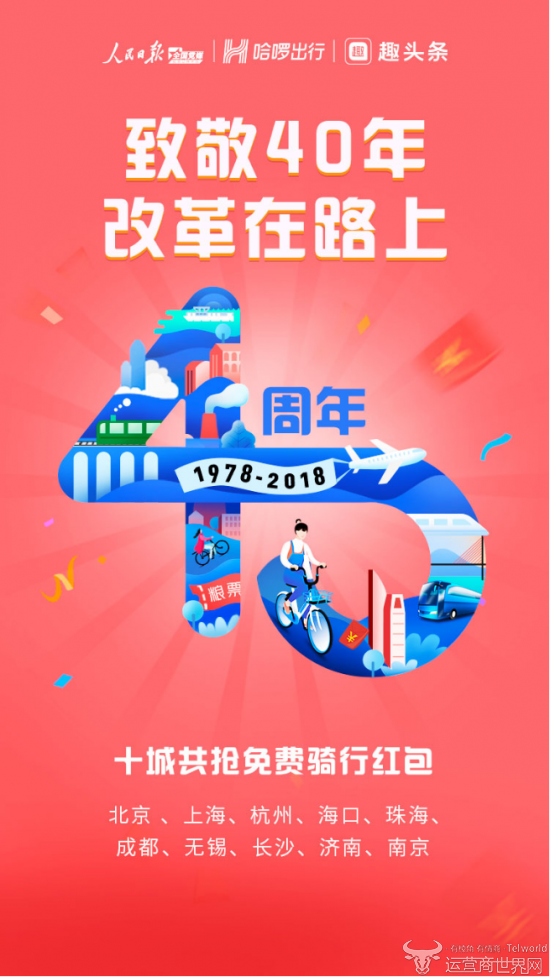 本次活动由人民日报全国党媒平台发起,联合哈啰出行、趣头条等多个品牌在全国范围内开展“致敬40年——庆祝改革开放40周年”大型互动活动,从出行方式、信息传播、生活服务等多个方面描绘改革开放40周年的巨变。