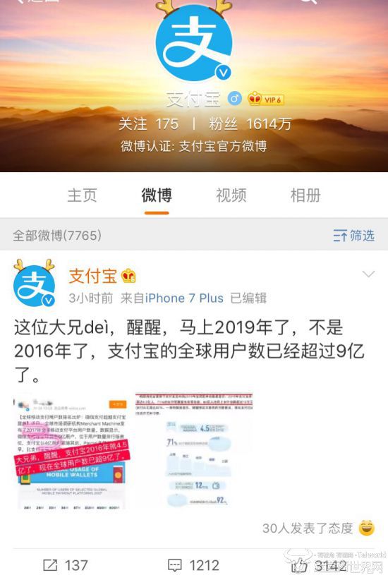 但有意思的是,在今日下午2点,支付宝在社交平台霸气回应称,“这位大兄dei,醒醒,马上2019年了,不是2016年了,支付宝全球用户数已经超过9亿了。”