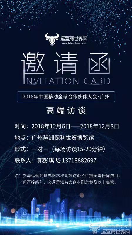 2018中国移动全球合作伙伴大会自2013年开启,迄今已成功举办5届,运营商世界网自成立至今,便一直对该大会跟踪全面报道,传播最新资讯,挖掘行业信息。本次通过已出炉的邀请函获悉,2018中国移动全球合作伙伴大会于12月6日-8日在广州琶洲保利世贸博物馆举办,同时运营商世界网设有高端访谈间,与各位受访领导的高端访谈将在此进行。本次访谈采用一对一的形式,采访对象均为知名企业副总裁以上高管,每场访谈时间再15~20分钟。邀请函的整体观感给人科技与深远的感受,深蓝色的空间犹如银河系的旷远,在高楼林立的城市上方环绕着交织的球形网,代表着全球相通的现代通信科技。