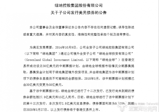 公告显示,2014年10月9日,绿地集团通过公司境外全资子公司“绿地全球投资有限公司”在香港交易所成功设立30亿美元的中期票据计划, 2018年5月,该中期票据计划规模已由30亿美元变更为50亿美元。