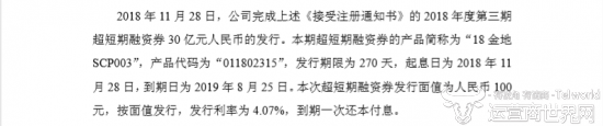 公告显示,2018 年 11 月 28 日,金地集团完成2018 年度第三期超短期融资券 30 亿元人民币的发行。本期超短期融资券的产品简称为“18 金地SCP003”,产品代码为“011802315”,发行期限为 270 天,起息日为 2018 年 11月 28 日,到期日为 2019 年 8 月 25 日。