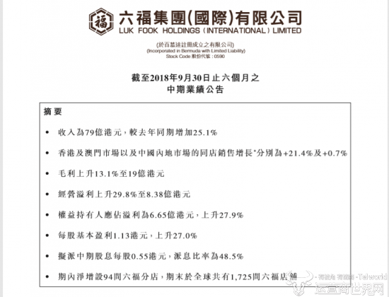 近日, 六福集团发布公告称,截至2018年9月30日止6个月,实现营收79亿港元,同比增加25.1%;毛利润19亿港元,同比上升13.1%;经营利润8.38亿港元,同比上升29.8%。