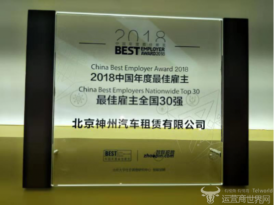 11月23日,“智场.未来”2018中国年度最佳雇主颁奖盛典暨中国人力资本国际管理论坛在成都举行。神州租车、腾讯、宝马中国、招商银行、万科、顺丰等企业荣登中国年度最佳雇主30强榜单,这也是神州租车连续第4年上榜。