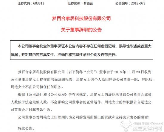 公告显示,梦百合董事周艳在11月29日递交了辞职书面报告,她因个人原因辞去公司董事一职,辞职后,周艳在公司不担任任何职务,且不会导致梦百合董事会成员人数低于法定最低人数,不会影响董事会的正常运作。梦百合董事辞职 离开的原因竟是这样的?