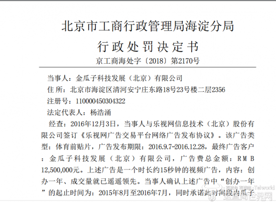今日,据北京市工商行政管理局海淀分局对金瓜子科技发展(北京)有限公司(瓜子二手车)进行了行政处罚。其判决书显示,瓜子二手车广告宣传中的“创办一年、成交量就已遥遥领先”缺乏事实依据,与实际情况不符。对此,工商局责令瓜子停止发布违法广告,并在相应范围内消除影响,罚款1250万元。