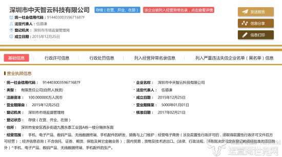 从百度企业信用信息上可知,深圳中天智云科技成立于2015年12月,注册资本100万元,主要从事手机、电子产品、数码产品、无线数据终端、手机配件的研发、销售等,法定代表人为吴克强。