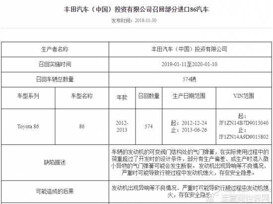 11月30日,丰田汽车(中国)投资有限公司(以下简称“中国丰田”)向国家市场监督管理总局备案了召回计划,决定自2019年1月11日起,召回2012年12月24日至2013年6月26日期间生产的部分进口86汽车,共计574辆。