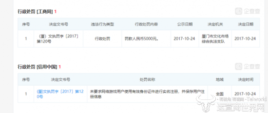 据企查查资料可知,去年10月份,厦门众联世纪科技有限公司还因未要求网络游戏用户用有效身份证件进行实名注册,并保存用户注册信息等原因受到处罚。