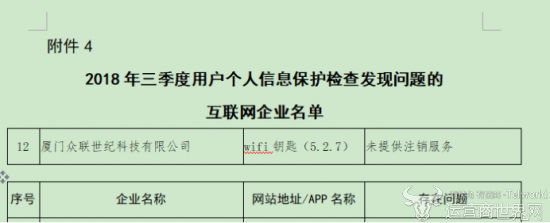 最近一段时间,关于涉及通信业务的企业审查又严格不少,日前工信部公布了2018年三季度用户个人信息保护检查发现问题的互联网企业名单,其中厦门众联世纪科技有限公司主营APP wifi钥匙因未提供注销服务而遭到通报。