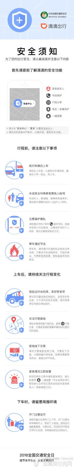 此外,在线上,滴滴还将持续加大对司机和乘客的交通安全提示和安全教育力度。自12月1日起,滴滴在乘客端内上线安全须知,倡导乘客关注交通安全细节,注意车牌一致后再上车,独自出行落座后排系好安全带等,同时重点提示乘客了解平台安全功能,如紧急联系人、号码保护、行程分享、录音录像保护、一键报警等,进一步增强乘客的安全乘车意识。