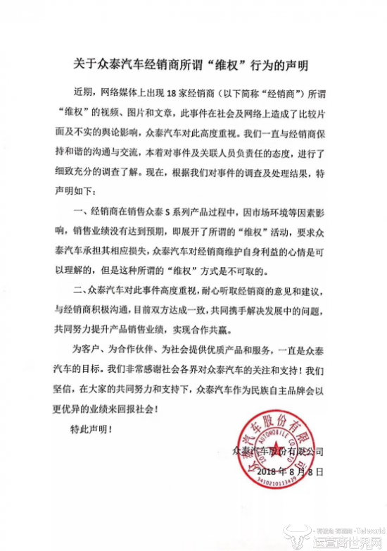 随后,众泰汽车官方回应声明众泰经销商“维权门”事件称,经销商在销售众泰S系列产品过程中,因市场环境等因素影响销售业绩没有达到预期,开展了所谓“维权”活动,要求众泰汽车承担损失,心情可以理解,但这种所谓的“维权”方式并不可取。