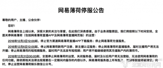 据公告显示,2018年12月3日12:00起,停止官方渠道网易薄荷直播App下载服务和充值服务;2018年12月6日12:00起,停止网易薄荷新用户、新主播的认证服务;停止网易薄荷的直播、短视频服务;2018年12月31日00:00起,全面停止网易薄荷的运营,关闭服务器。