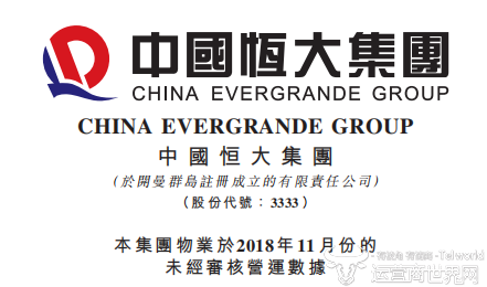 近日,中国恒大集团(连同其附属公司统称“恒大集团”)董事局宣布,恒大集团物业于2018年11月份的合约销售金额约为人民币340.7亿元,合约销售面积约为326.6万平方米,合约销售均价为每平方米人民币10431元。