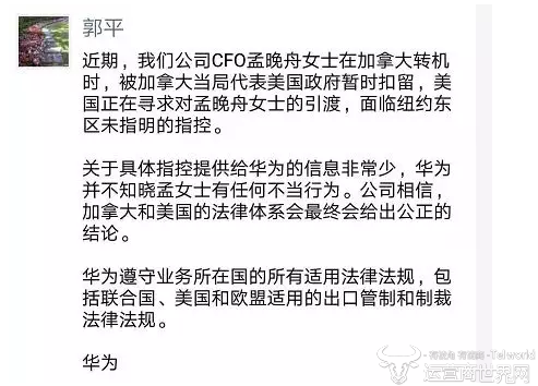目前,华为董事、公共及政府事务部总裁陈黎芳,疑似华为轮值董事长郭平等众多高层一致回应称:华为遵守业务所在国的所有适用法律法规,包括联合国、美国和欧盟的出口管制和制裁法律法规,目前关于具体的指控非常少,华为方孟晚舟并无任何不当行为。