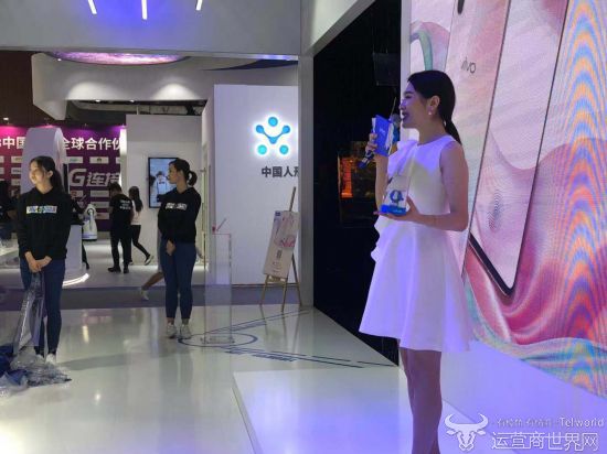 值得注意的是,与其他展区不同的是,vivo除了展示自己的5G产品,还专门设主持人为媒体记者介绍5G真机,同时还有美丽的模特来展示产品,因此吸引了不少人来驻足观看。