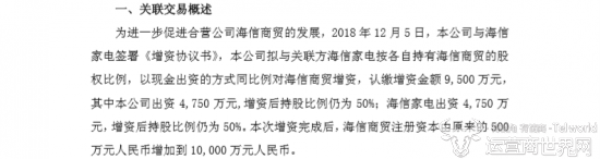 公告称,青岛海信拟与关联方海信家电按各自持有海信商贸的股权比例,以现金出资的方式同比例对海信商贸增资,认缴增资金额 9500 万元。