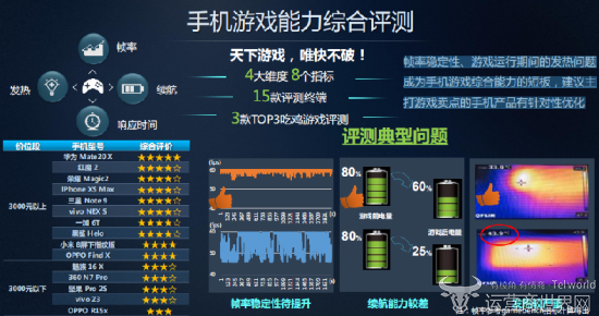 最后,在手机游戏能力综合评测中,帧率稳定性、游戏运行期间的发热问题成为手机游戏综合能力的短板,中国移动智能硬件测试中心建议主打游戏卖点的手机产品要有针对性优化。