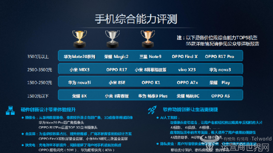 从评测出的各价位段综合能力TOP5机型排行榜中可以看到,在1500元以下的手机中,荣耀8X排名第一;在1500-2500元的手机中,华为nova3i排名第一;在2500-3500元的手机中,小米MIX3排名第一;而在3500元以上的手机中,华为Mate20系列排名第一。