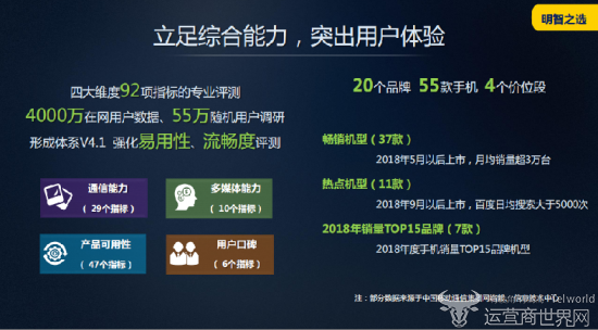据了解,此次评测不仅有着四大维度92项指标的专业评测,包括通信能力(29个指标)、多媒体能力(10个指标)、产品可用性(47个指标)以及用户口碑(6个指标)。