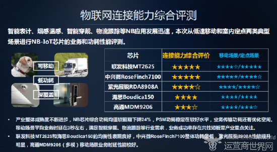 最后是连接能力方面,随着智能表计、烟感温感、智能穿戴、物流跟踪等NB应用发展迅速,此次便从低速移动和室内定点两类典型场景进行NB-IoT芯片的业务和功耗性能评测。