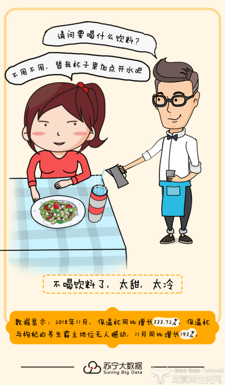 另一方面,养生攻略走红。冰可乐换成热茶,睡前一杯热牛奶。吃饭点饮料被自带保温杯替代,“跟服务员说加点水,都已经成习惯了。”苏宁数据显示,2018年11月,保温杯同比增长333.72%。保温杯与枸杞的养生霸主地位无人撼动,同比增长193%。