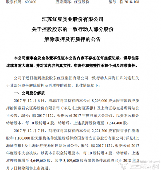 公告显示,2018年12月10日,周海江将其持有红豆总股本的 0.52%的流通股、刘连红将其持有的0.17%的流通股(占公司总股本的 )质押给国泰君安证券股份有限公司,用于办理股票质押式回购业务,初始交易日为 2018年12月10日,购回交易日为2019年12月10日。