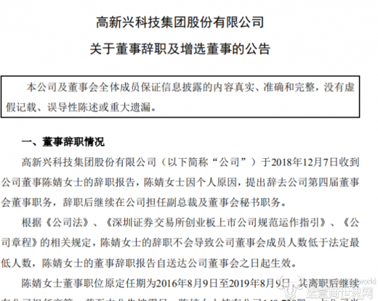 12月10日,高新兴科技集团发布公告称,副总裁陈婧辞去公司第四届董事会董事职务,但辞职后继续在公司担任副总裁及董事会秘书职务。