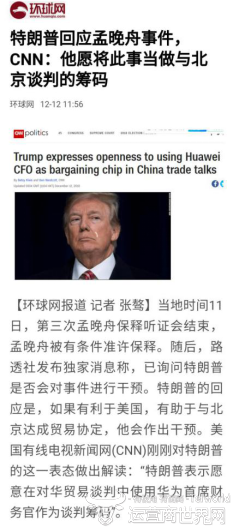 美国有线电视新闻网(CNN)刚刚对特朗普的这一表态做出解读:“特朗普表示愿意在对华贸易谈判中使用华为首席财务官作为谈判筹码”。